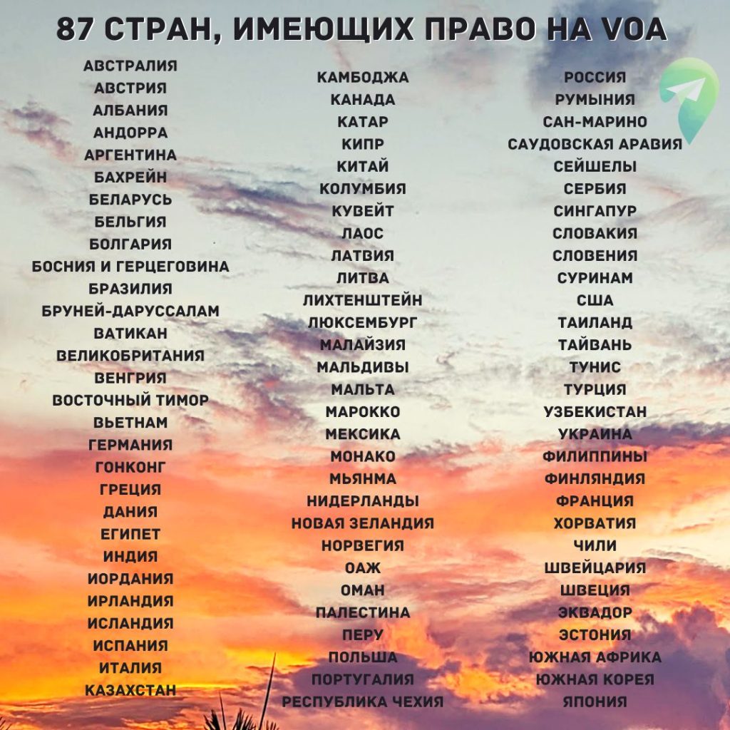 Список стран, доступных для оформления визы по прибытии (VoA), расширился еще на одну страну. С 18 января 2023 года VoA доступен для граждан 87 стран, в том числе и Казахстана.